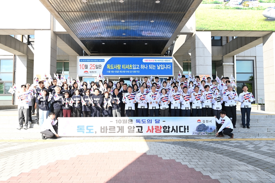 김천시는 지난 25일 고종 독도주권 칙령반포 124주년을 기념해 시청 전정에서 ‘독도사랑 티셔츠 입기 운동’을 전개했다고 밝혔다.