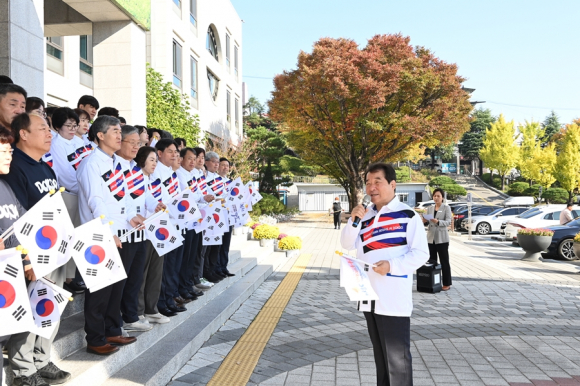 이날 행사에 참여한 김천시 직원 및 독도사랑 국민연합 회원 등 70여 명은 독도사랑 티셔츠를 입고 ‘독도는 한국 땅!’구호 제창과 함께 태극기를 흔들며 독도의 소중함을 알리고 독도 수호 의지를 다지는 시간을 가졌다.