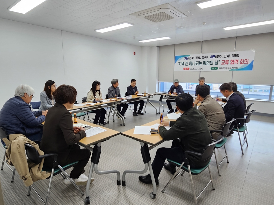 대덕면은 13일 행정복지센터 회의실에서 경남 거창군 고제면과 전북 무주군 무풍면 3도 3면의 면장을 비롯한 각 지역 이장협의회장과 임원단, 공무원들이 참석한 가운데 지속적인 교류와 협력 상생과 화합을 더욱 도모하기 위한 회의를 열었다.