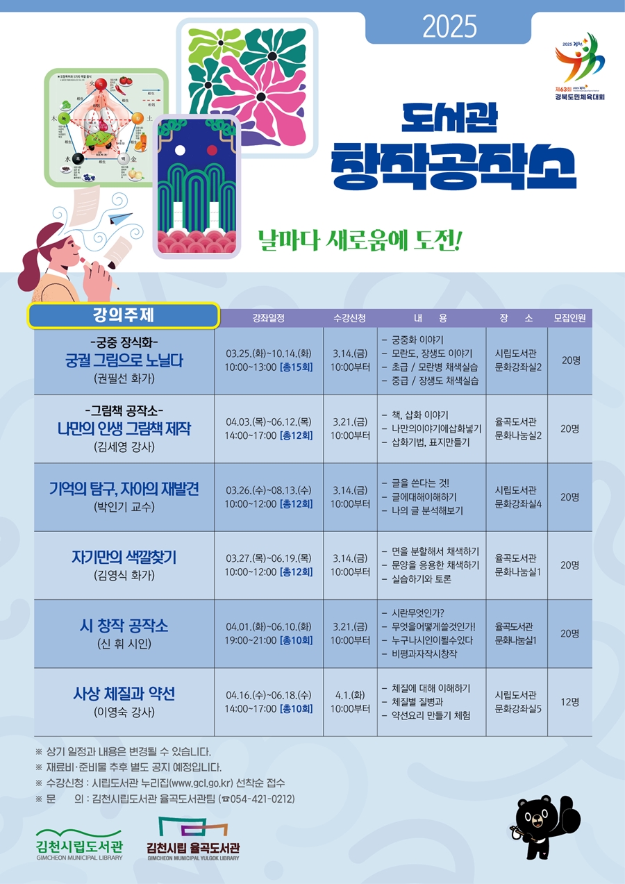 <2025 도서관 창작공작소>는 궁중장식화(궁궐 그림으로 노닐다), 그림책 공작소(나만의 인생 그림책 제작), 기억의 탐구 자아의 재발견, 자기만의 색깔 찾기, 시 창작 공작소, 사상 체질과 약선 총 6개 강좌로 다채롭게 구성되며, 시민들이 창작의 즐거움을 느낄 수 있도록 이론과 실습 강의를 병행하는 형식으로 진행된다.