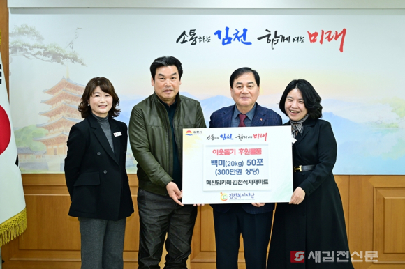 김천식자재마트가 지역 사회와의 상생을 위해 16일 혁신맘카페에 쌀 50포(10kg)를 기탁하며 온정을 나눴다.