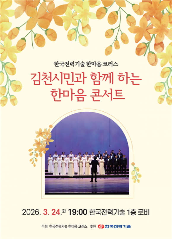 김천시에 본사를 두고있는 한국전력기술의 임직원 및 김천시 주민들로 구성된 한마음코러스가 직원들의 정서함양 및 혁신도시 이전기관의 지역상생 문화활동의 일환으로 김천시민과 함께하는 한마음 음악회를 개최한다.