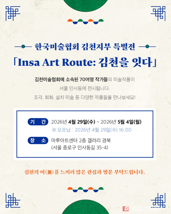 김천시는 4월 29일부터 5월 4일까지 6일간 서울 마루아트센터 2층 갤러리 경북에서 한국미술협회 김천지부 특별전 ‘인사 아트 루트(Insa Art Route): 김천을 잇다’를 개최한다고 밝혔다.