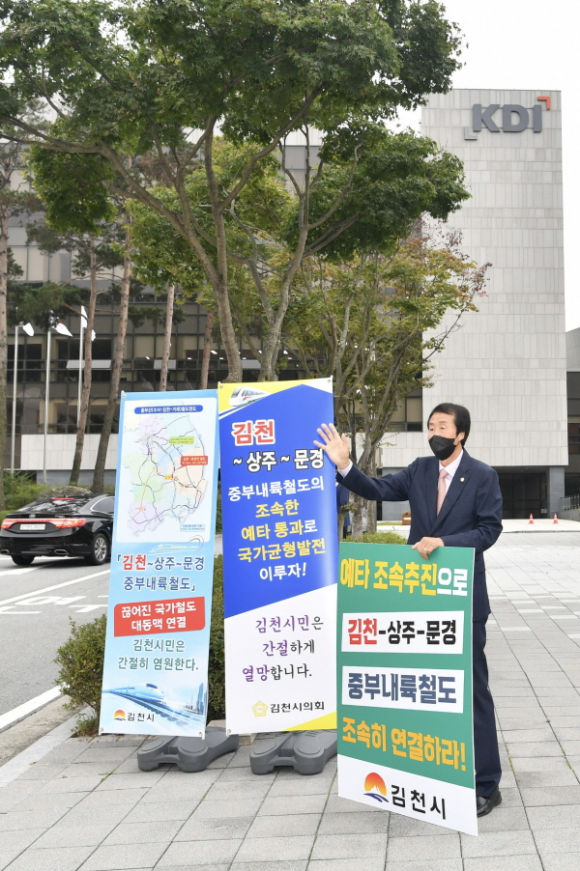 김천시의회 이우청 의장은 6일 오전 세종시 한국개발연구원(KDI) 전정에서 중부내륙철도의 단절구간인 김천~문경 구간의 조속한 연결을 촉구하는 1인 피켓시위에 나섰다.